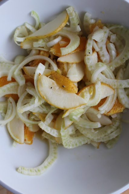I haven't used fennel too much in my life time. I cannot say I am a huge fan but it went well with the pears and citrus in this salad.